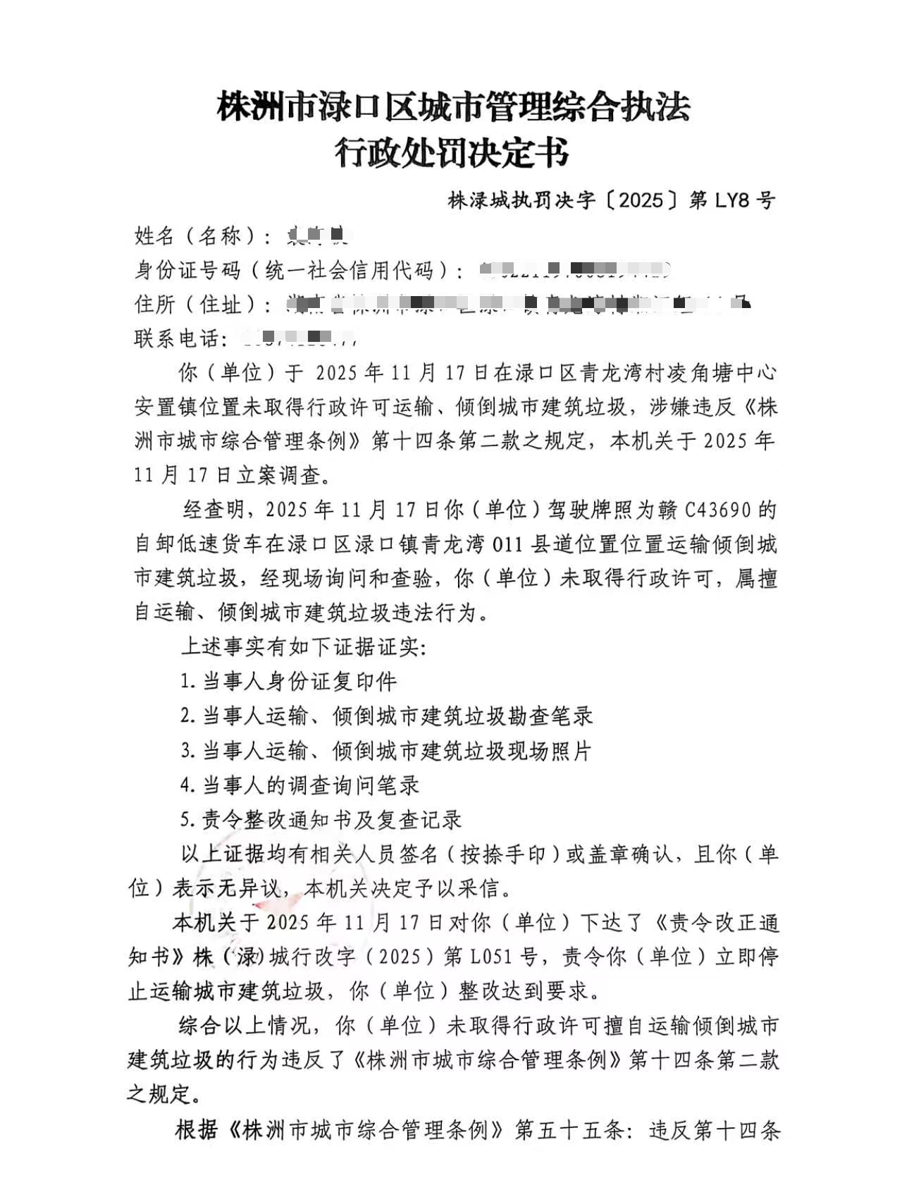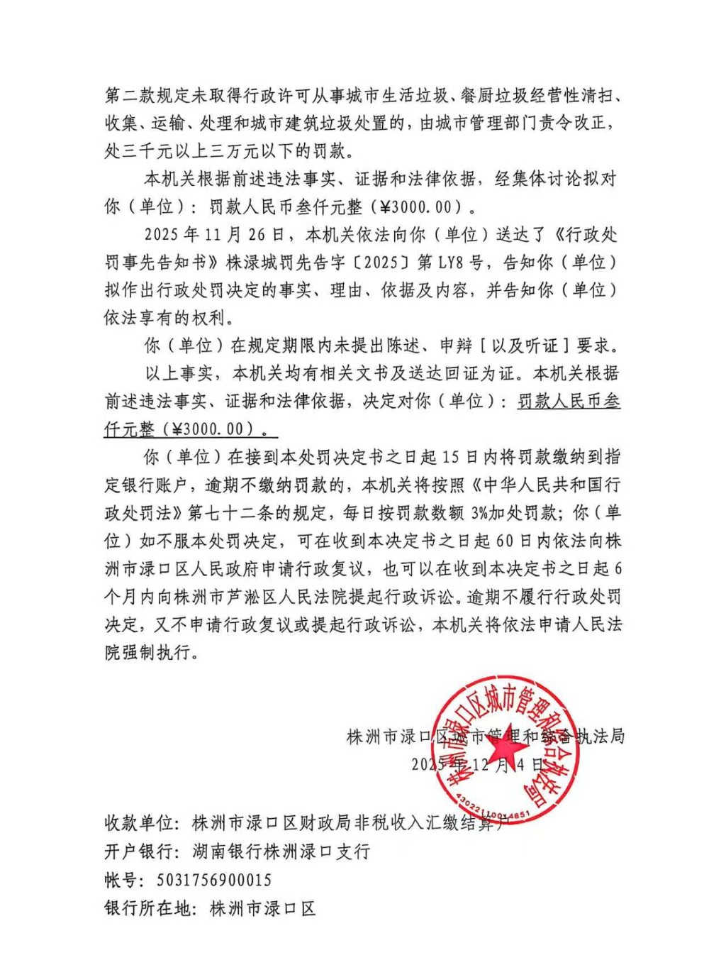 株洲市渌口区城市管理和综合执法局行政处罚决定书 株(渌)城执罚决字〔2025〕第LY8号