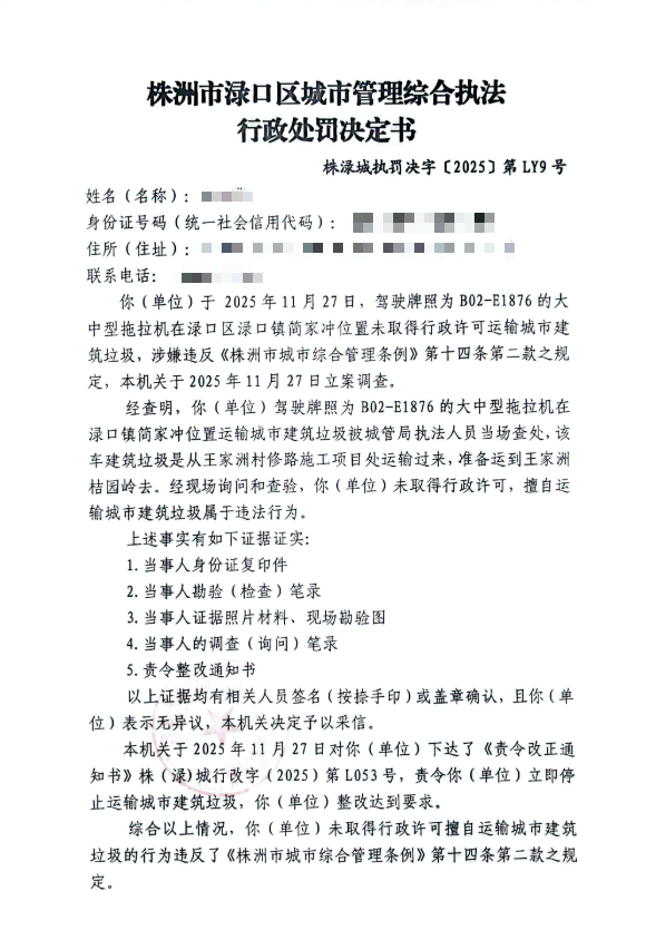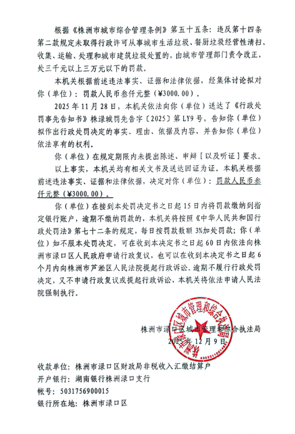 株洲市渌口区城市管理和综合执法局行政处罚决定书 株(渌)城执罚决字〔2025〕第LY9号