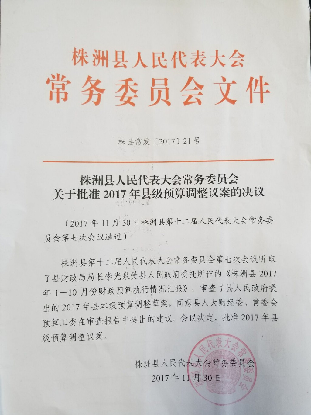 株洲县人民代表大会常务委员会关于批准2017年县级预算调整议案的决议
