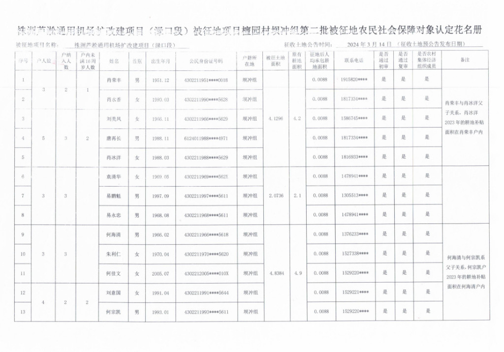 根据《关于进一步做好被征地农民社会保障工作的通知》(湘人社规〔2023〕1号)《关于印发〈株洲市被征地农民社会保障实施办法〉的通知》(株人社发〔2024〕7号)文件精神,经征地村(社区)初审,镇复审,区人民政府组织联合会审,确定我区株洲芦淞通用机场扩改建项目(渌口段)被征地项目檀园村坝冲组第二批符合被征地农民社会保障对象条件的共18人。现按照文件规定进行第二轮公示,公示期间,如有异议,可向渌口区人民政府进行举报,申请复核。