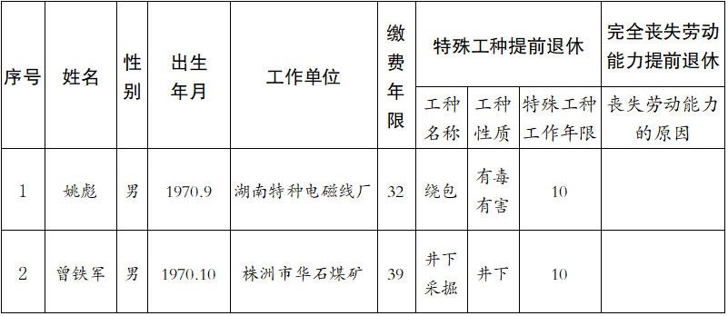 现将拟办理特殊工种提前退休人员基本情况予以公示,公示时间5个工作日(2025年10月10日至10月15日)。如有异议,请在公示期内向12333或本单位(举报电话:0731-27560802)反映。