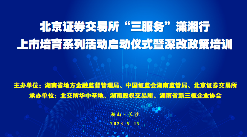 2023年9月19日—20日,湖南省地方金融监督管理局、中国证监会湖南监管局与北京证券交易所、全国股转系统共同举办“三服务”潇湘行上市培育系列活动。活动贯彻“开门服务、直达服务、精准服务”的“三服务”理念,通过政策宣讲、经验分享、实地走访、座谈交流等多种形式,第一时间宣传解读北交所深化改革政策,倾听了解企业诉求,指导企业做好上市工作,在地方政府、北交所、拟上市企业及中介机构之间搭建沟通的桥梁,加快推动湖南创新型中小企业北交所上市。