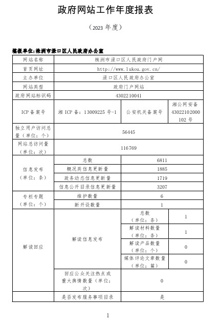 根据《国务院办公厅关于做好政府网站年度报表发布工作的通知》(国办函〔2018〕12号)和《湖南省人民政府办公厅关于做好政府网站年度报表发布工作的通知》(湘政办明电〔2018〕7号)文件要求,现将《株洲市渌口区政府网站工作年度报表(2022年度)》公示如下: