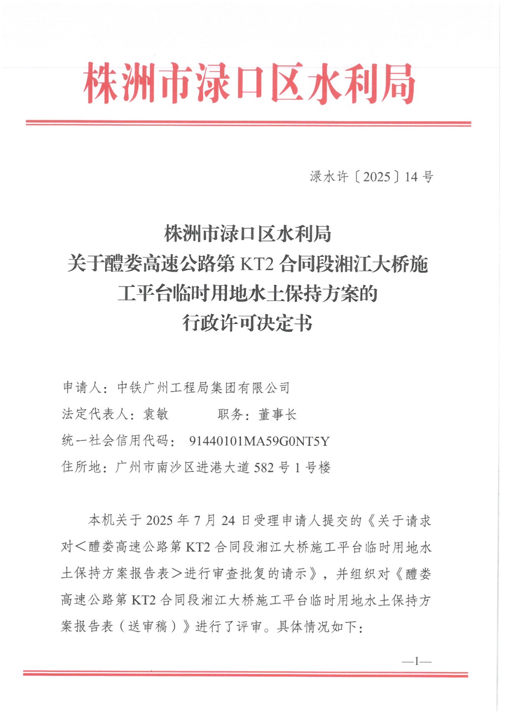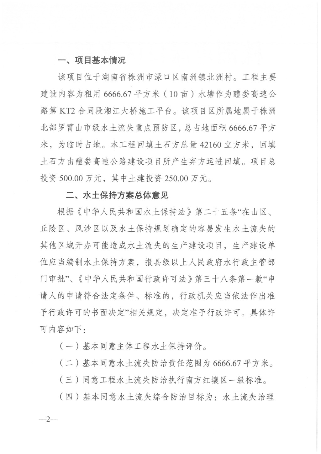 株洲市渌口区水利局关于醴娄高速公路第KT2合同段湘江大桥施工平台临时用地水土保持方案的行政许可决定书