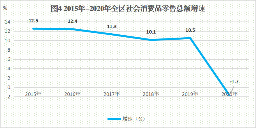 2020年全区社会消费品零售额50.2亿元,比上年下降1.7%,分别高于全国、全省、全市2.2、0.9、0.6个百分点;按消费形态统计,商品零售额43.7亿元,增长1.4%,餐饮消费额3.05亿元,下降5.4%。按销售地区分,城镇零售额41.7亿元,下降1.6%;乡村零售额8.54亿元,下降1.9%。按行业分,批发业、零售业、住宿业、餐饮业分别为1.48、47.8、0.26、0.68亿元,同比分别下降2.5%、1.1%、6.1%、3.1%。分限额类别看,限额以上7亿元,增长10.4%,限额以下43.2亿元,下降3.4%。限额以上企业商品零售额中,粮油、食品类零售额增长20.7%,饮料类零售额增长26.7%,烟酒类零售额增长33.5%,服装、鞋帽、针纺织品类零售额增长18.7%,化妆品类零售额增长28.7%,日用品类零售额增长16.2%,家用电器和音像器材类零售额增长21.5%,中西药品类零售额增长9.8%,石油及制品类零售额增长15.5%。全年新增市场主体3122个,其中,新设立企业723家,农民专业合作社98家,个体户2301户。