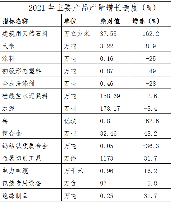 表1 2021年主要工业产品产量增长速度